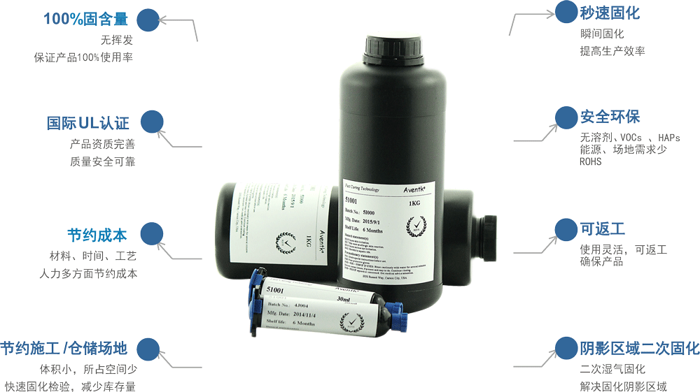 AVENTK 1019系列對有鍍層的PMMA和PC材料體現出良好的粘接力。有非常好的密封性可以保證固化更完全。尤其對于攝像頭粘接具有絕佳效果。AVENTK 配合LED UV 固化設備效果最佳。