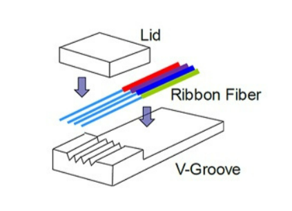光纖陣列(Fiber Array, FA)是利用V形槽(即V槽,V-Groove)基片,把一束光纖或一條光纖帶按照規定間隔安裝在基片上,所構成的陣列。主要由基板、壓板及光纖組成,通常為減低損耗依靠精密刻化的V型槽實(shí)現光纖芯的精準分置定位,再通過(guò)加壓部器件并用粘合劑固定,經(jīng)過(guò)端面研磨而形成光纖陣列。